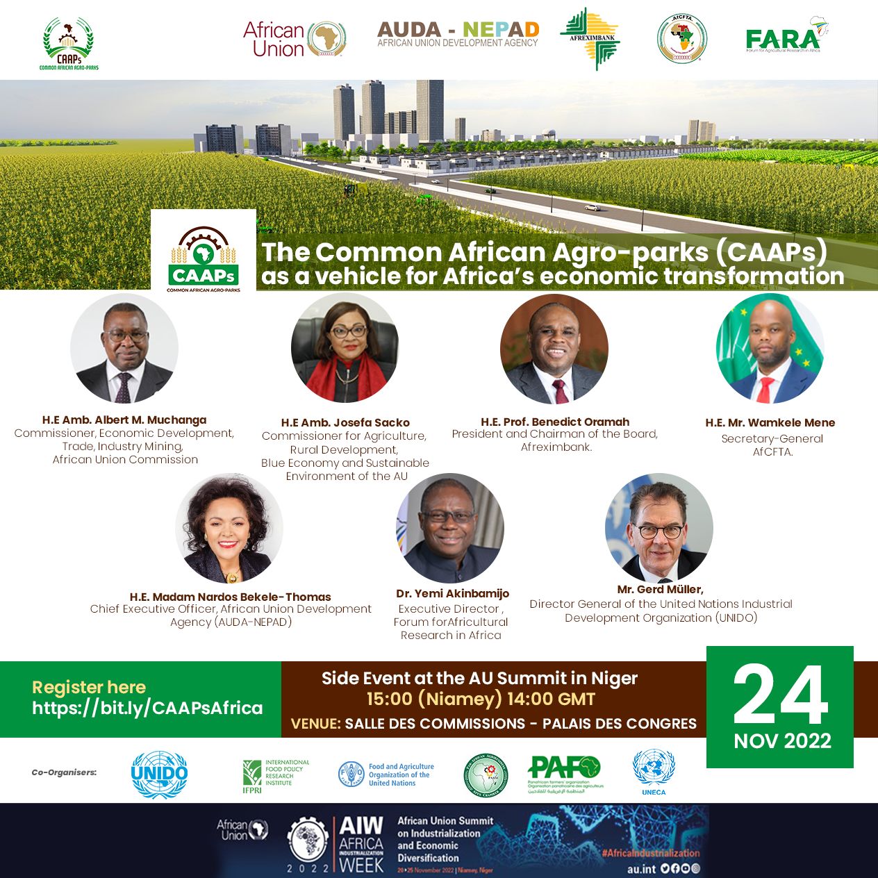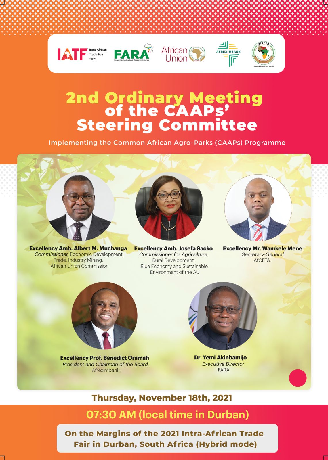 The Common African Agro-Parks Programme (CAAPs) was initiated in 2019 as one of the concrete initiatives of the Comprehensive African Agricultural Programme (CAADP) to be implemented within the framework of the African Union (AU) Agenda 2063 for achieving the CAADP Malabo commitments, especially the one on “tripling Intra-African trade for agricultural commodities and services.