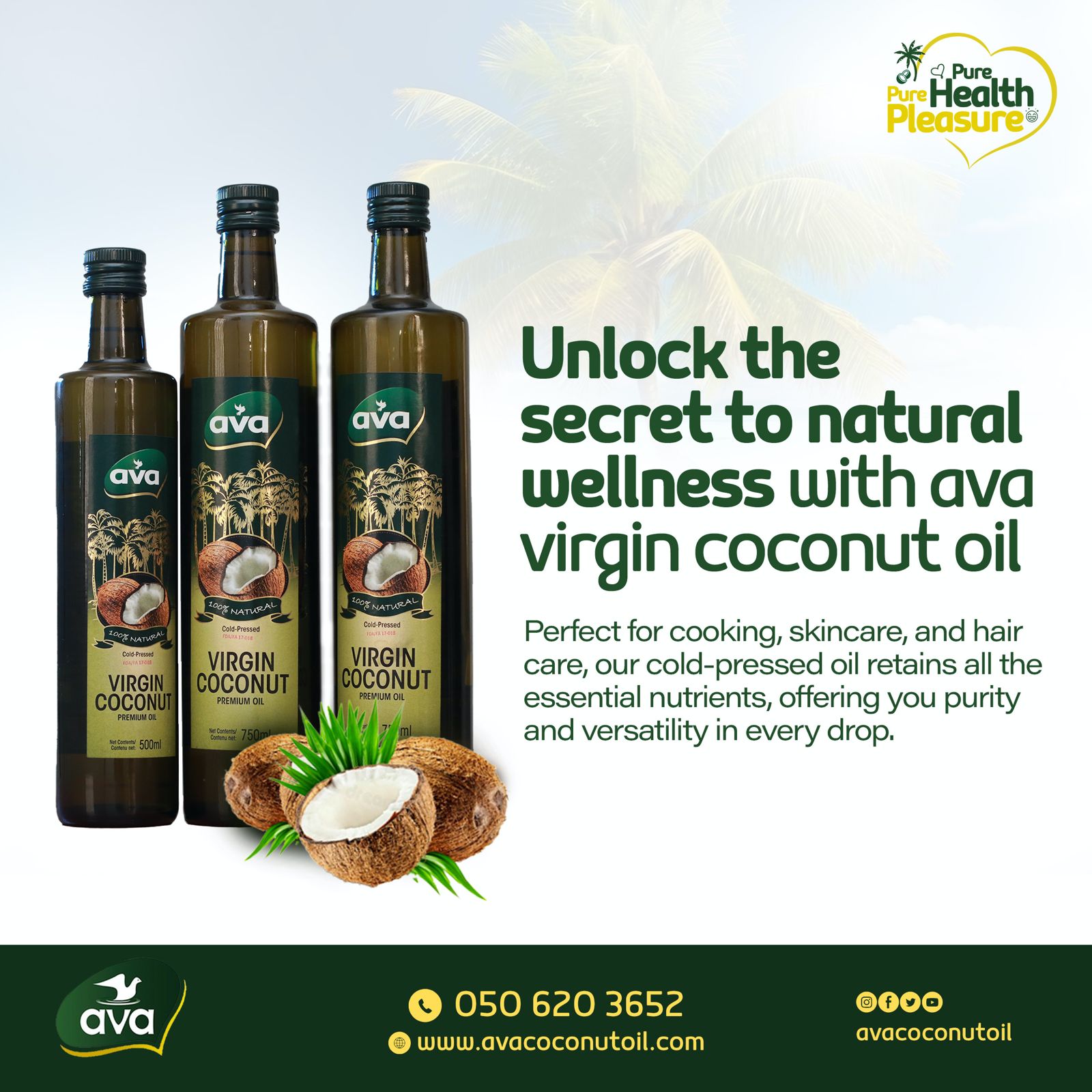“Why AVA Virgin Coconut Oil?” – explainer video about cold-pressed technique, certifications (FDA Ghana, Ghana Standards Authority), and quality assurance testing.
